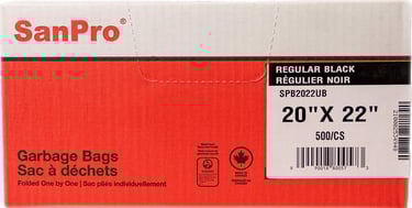 Low-density polyethylene garbage bags made of 100% recycled resin. Made in Canada, folded one by one.