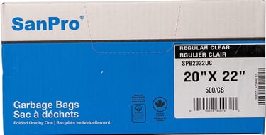Low-density polyethylene garbage bags made of 100% recycled resin. Made in Canada, folded one by one.