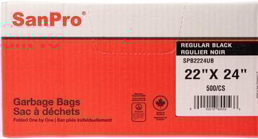 Low-density polyethylene garbage bags made of 100% recycled resin. Made in Canada, folded one by one.