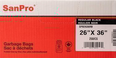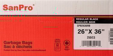 Low-density polyethylene garbage bags made of 100% recycled resin. Made in Canada, folded one by one.