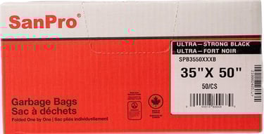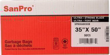 Low-density polyethylene garbage bags made of 100% recycled resin. Made in Canada, folded one by one.