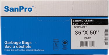 Low-density polyethylene garbage bags made of 100% recycled resin. Made in Canada, folded one by one.