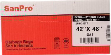 Low-density polyethylene garbage bags made of 100% recycled resin. Made in Canada, folded one by one.