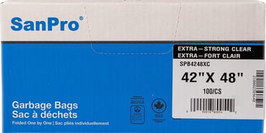 Low-density polyethylene garbage bags made of 100% recycled resin. Made in Canada, folded one by one.