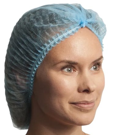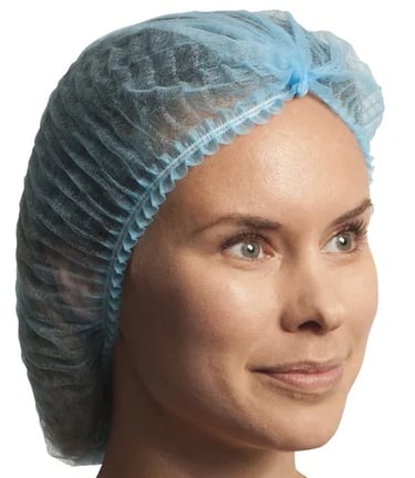 Breathable nonwoven polypropylene bouffant caps in a blue colour and pleated design.