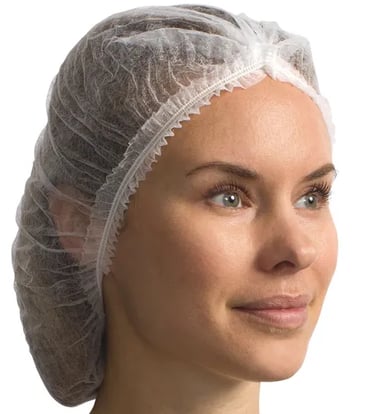 Breathable nonwoven polypropylene bouffant caps in a white colour and pleated design.