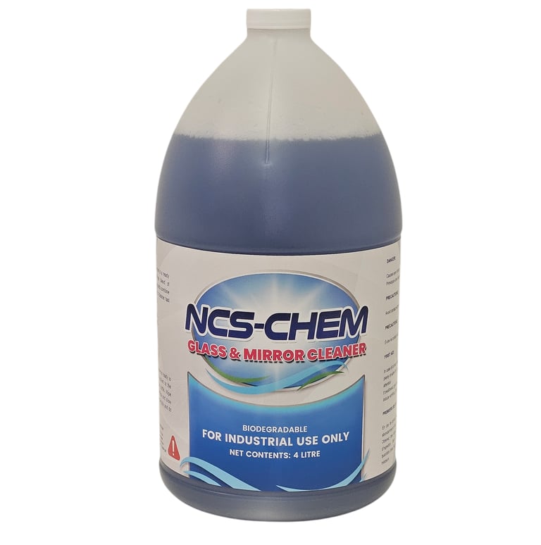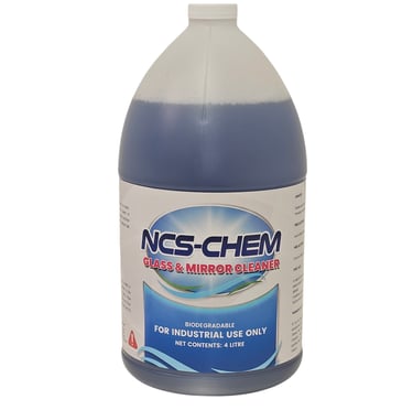 NCS-CHEM Glass & Mirror Cleaner has been formulated to remove build-ups on glass and other highly polished surfaces. Its formula will not streak or smear and makes glass, mirrors, chrome, tile, and porcelain sparkle like new.
