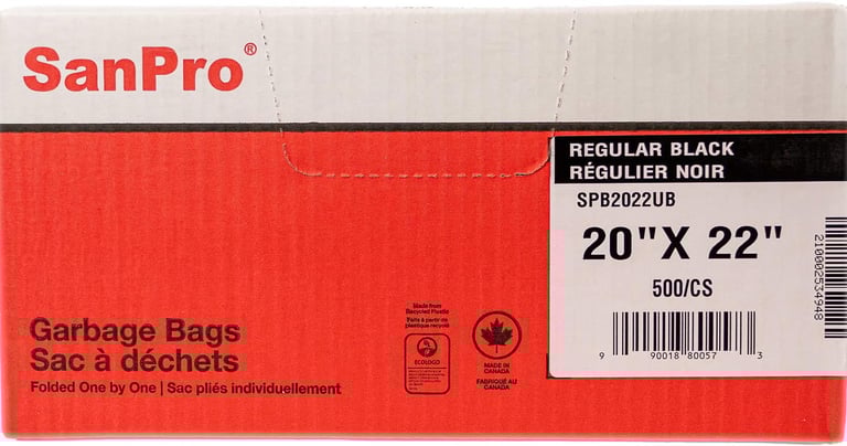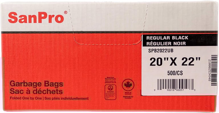 Low-density polyethylene garbage bags made of 100% recycled resin. Made in Canada, folded one by one.