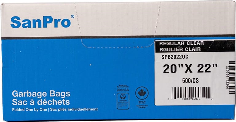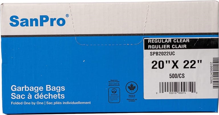 Low-density polyethylene garbage bags made of 100% recycled resin. Made in Canada, folded one by one.