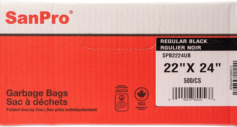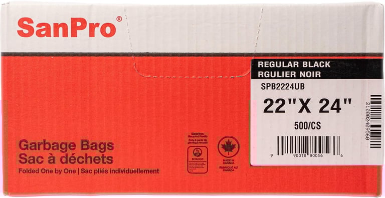 Low-density polyethylene garbage bags made of 100% recycled resin. Made in Canada, folded one by one.