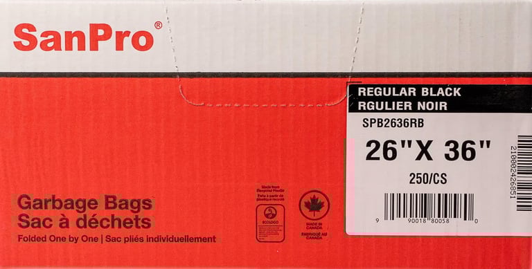 Low-density polyethylene garbage bags made of 100% recycled resin. Made in Canada, folded one by one.