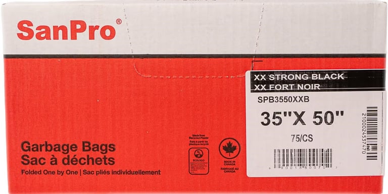 Low-density polyethylene garbage bags made of 100% recycled resin. Made in Canada, folded one by one.