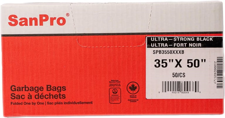 Low-density polyethylene garbage bags made of 100% recycled resin. Made in Canada, folded one by one.