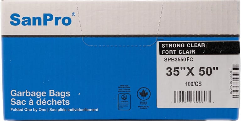 Low-density polyethylene garbage bags made of 100% recycled resin. Made in Canada, folded one by one.