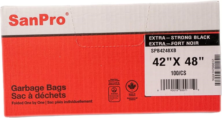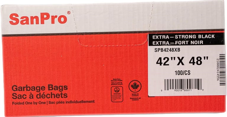 Low-density polyethylene garbage bags made of 100% recycled resin. Made in Canada, folded one by one.