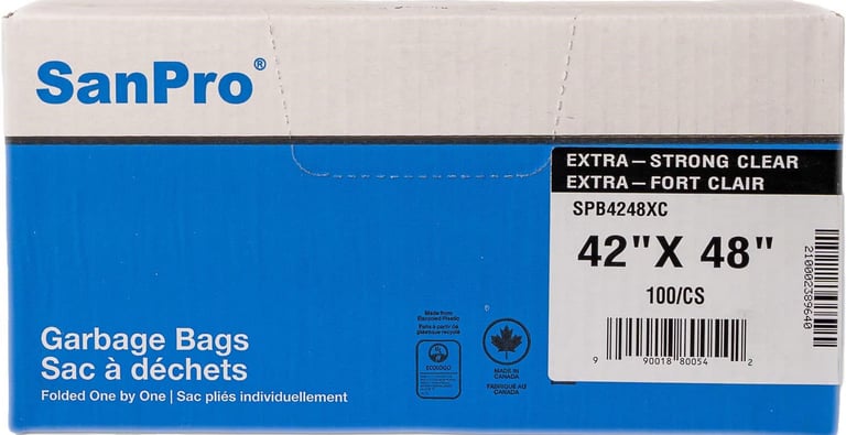 Low-density polyethylene garbage bags made of 100% recycled resin. Made in Canada, folded one by one.