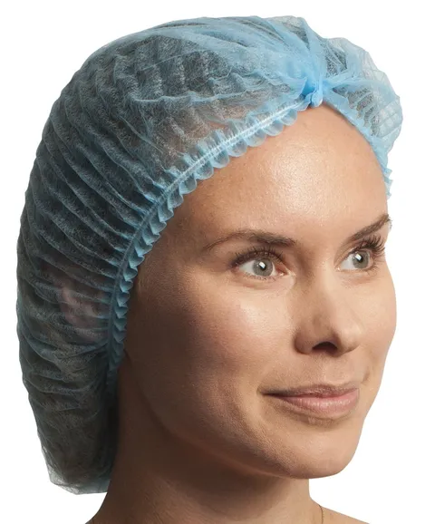 Breathable nonwoven polypropylene bouffant caps in a blue colour and pleated design.