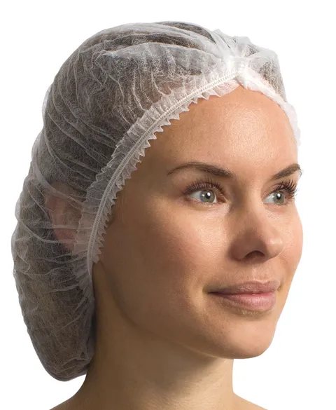 Breathable nonwoven polypropylene bouffant caps in a white colour and pleated design.