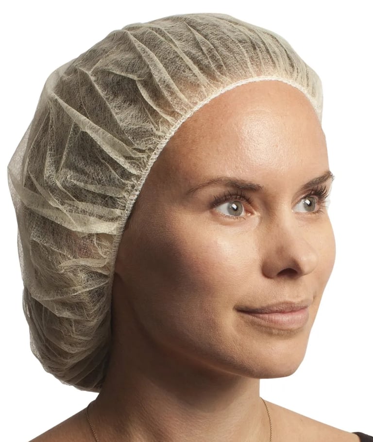 Breathable nonwoven polypropylene bouffant caps in a yellow colour.